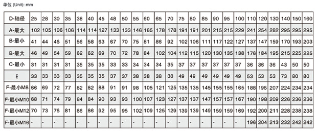 A-蓋直徑   B-填料腔內(nèi)徑直   C-軸或軸套直徑   E-填料腔外側(cè)密封長(zhǎng)度   F-相應(yīng)于不同螺栓規(guī)格的最小螺栓中心距